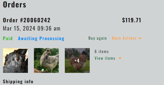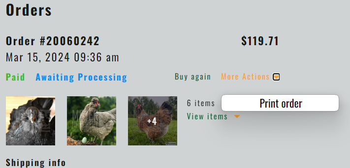 When you click on “Print Order” This opens your order in a new tab or window and shows the full order details, including the Hatch Date, Estimated Arrival window, and your substitution notes.